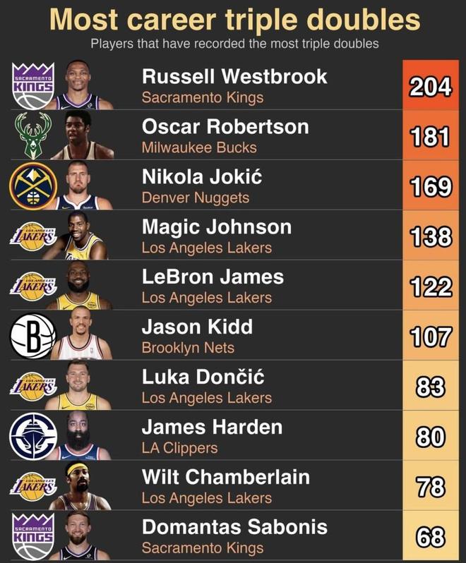 最近篮球数据账号发布了“职业生涯三双次数榜单”。威斯布鲁克、约基奇等名将入选,威斯布鲁克以204次高居第1。争议也随之而来——这些三双究竟在为胜利服务,还是“为了三双而三双”?这张榜单比拼的是数量,还是能把球队带向胜利的价值?